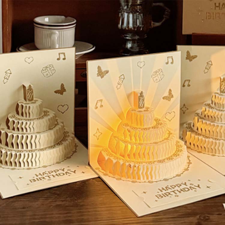 Die Abdeckung der 3D -Geburtstagskarte wird mit einem farbigen Prägungsverfahren hergestellt. Das Innenraum verfügt über ein Design eines 4-Schicht-Kuchens, und eine kleine Grußkarte wird zur Glückwunschbotschaft hinzugefügt.