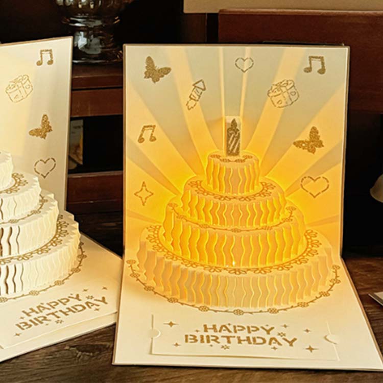 Die 3D -Geburtstagskarte enthält elektronische Komponenten mit Beleuchtung und Musikeffekten. Es ist einfach zu bedienen.