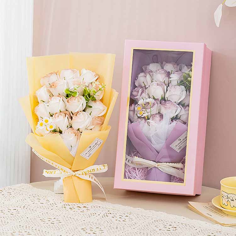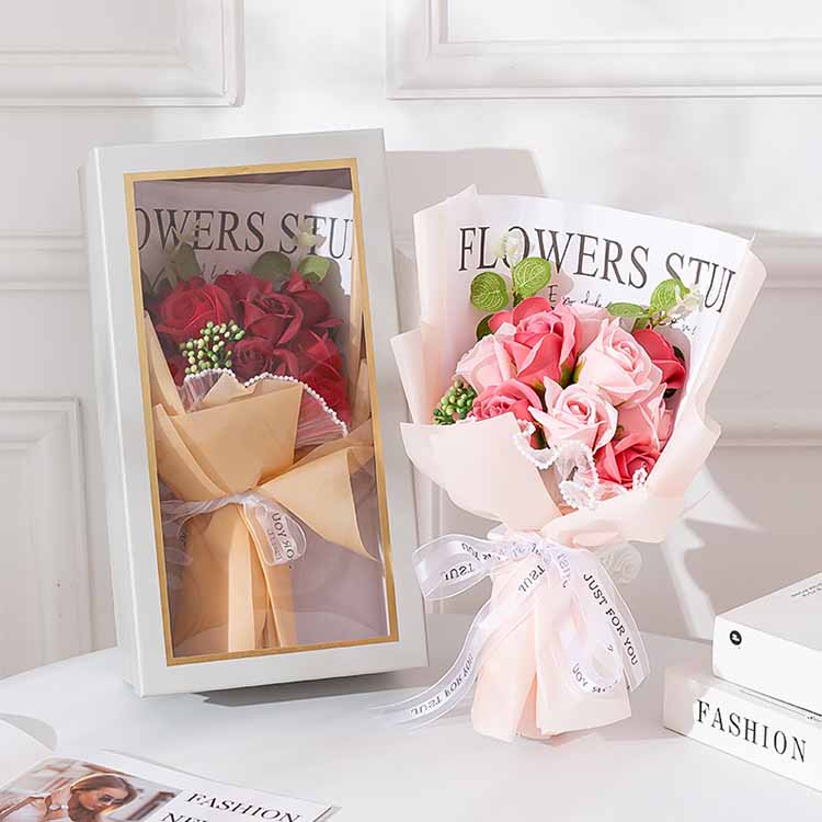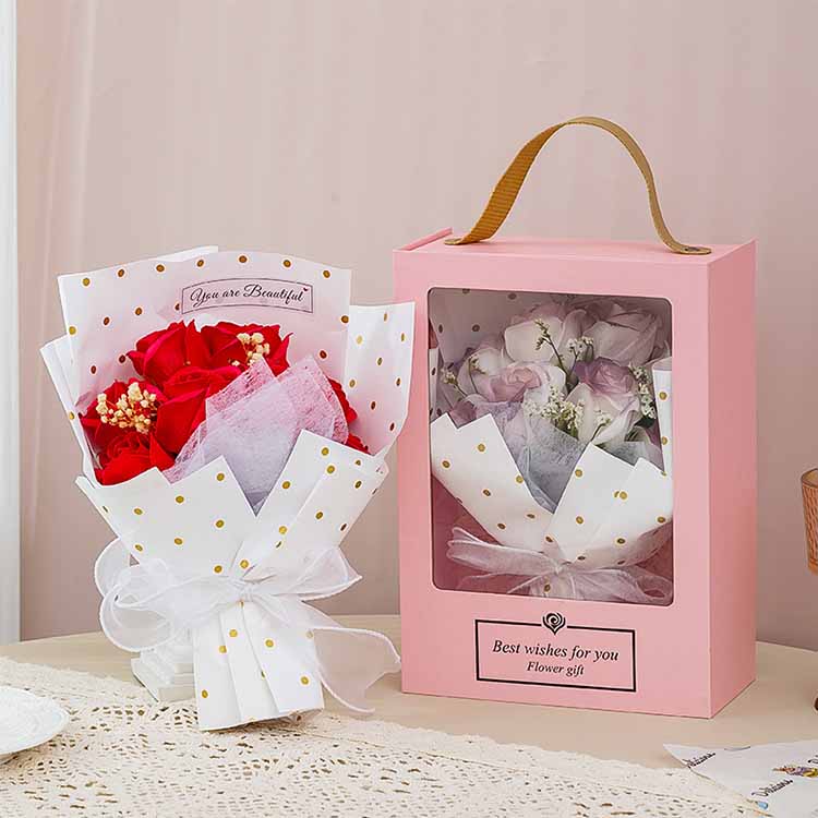 Die Blumenstrauß-Geschenkbox verfügt über Heißprägung, transparente Ränder und geprägte Materialien, wodurch die Blumen vielschichtiger und hochwertiger wirken können. Die verwendeten Materialien sind Pappe, Laminierung und umweltfreundliche Materialien, die druck- und verformungsbeständig sind. Während eines Festivals können Kunden je nach Bedarf einkaufen, was sehr kostengünstig ist.