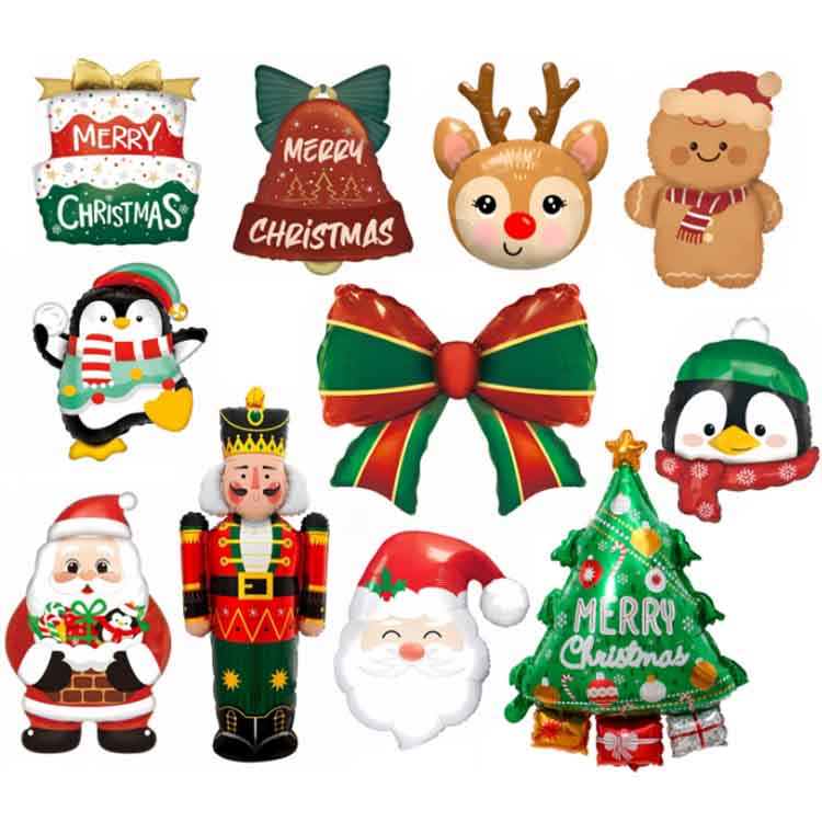 Weihnachtsballons aus Aluminiumfolie integrieren weihnachtliche Elemente in ihre Designs. Diese Ballons sind in klassischen Formen wie Weihnachtsmann, Weihnachtsbäumen, Schneeflocken und Glocken erhältlich und mit „Frohe Weihnachten“-Slogans verziert. Die Farben enthalten weihnachtliche Elemente, vor allem weihnachtliche Farben wie Rot, Grün, Gold und Silber, die eine festliche Atmosphäre schaffen. Sie sind in einer Vielzahl von Größen erhältlich, von Mini-30 cm bis hin zu riesigen 100 cm, und decken eine Vielzahl dekorativer Szenarien und Bedürfnisse ab.
