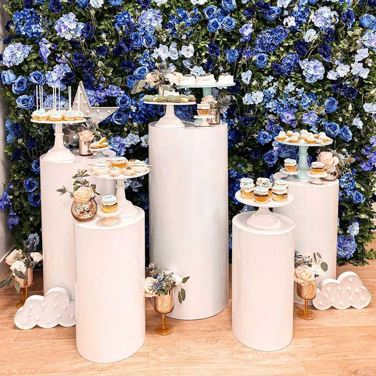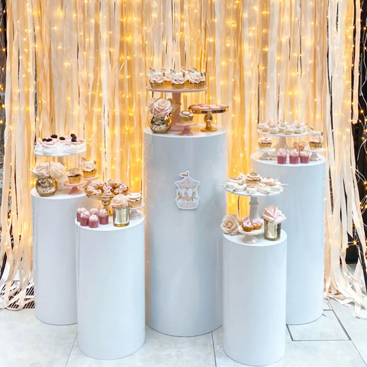 Der Desserttisch mit zylindrischer Basis dient sowohl als Behälter als auch als Dekoration. Normalerweise gibt es sie in verschiedenen Kombinationen: 3-teilige Kombinationen, 5-teilige Kombinationen, 7-teilige Kombinationen und so weiter. Die häufigste Kombination sind fünf Teile. Unabhängige zylindrische Röhren unterschiedlicher Größe können flexibel angeordnet werden und sind ein wichtiger Bestandteil der Szene. Gleichzeitig bieten wir auch individuelle Anpassungen in Größe und Form an. Darüber hinaus passen sie zu Ihrer Partydekoration.