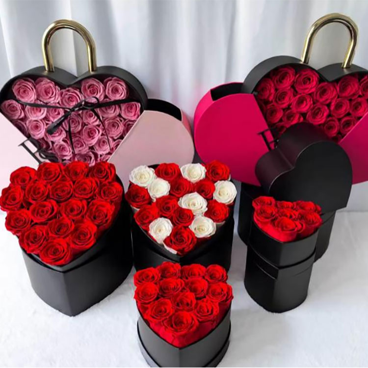 Bei den Blumen in dieser Geschenkbox mit ewigen Blumen handelt es sich um echte Blumen, die einem speziellen Konservierungsprozess unterzogen wurden, um ihre ursprüngliche Form und leuchtende Farbe zu bewahren. Sie verwelken nicht so leicht und sind 3–5 Jahre haltbar.