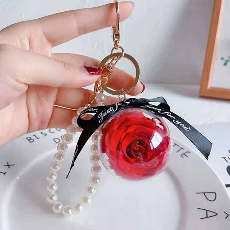 Der Eternal Flower-Schlüsselanhänger von New Shine verfügt über eine runde, hochtransparente Acrylkugeldekoration, die die konservierte Blume besser schützt und die Konservierung erleichtert. Sein Hauptkörper hat einen Durchmesser von genau 5 cm und wiegt etwa 32,5 Gramm. Es hat die Größe einer Handfläche, trägt nicht auf, wenn es am Schlüsselbund hängt, und sieht auch auf einer Tasche nicht fehl am Platz aus. Es stehen mehrere Farben zur Verfügung.