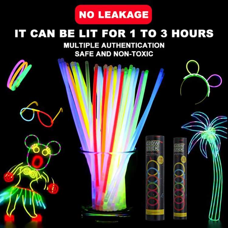 Der Leuchtstab wurde zu einer helleren und auffälligeren Farbe aufgewertet. Es kann 1 bis 3 Stunden lang beleuchtet bleiben. Das in den Leuchtstoffstäben verwendete fluoreszierende Material weist eine hohe Konzentration auf, was zu einem langanhaltenden und hochintensiven Leuchten führt.