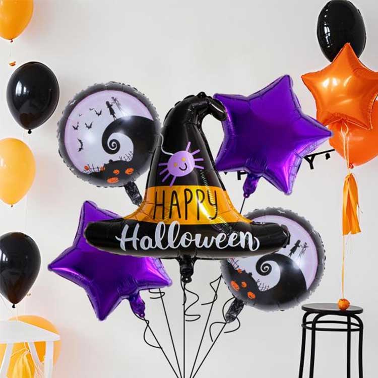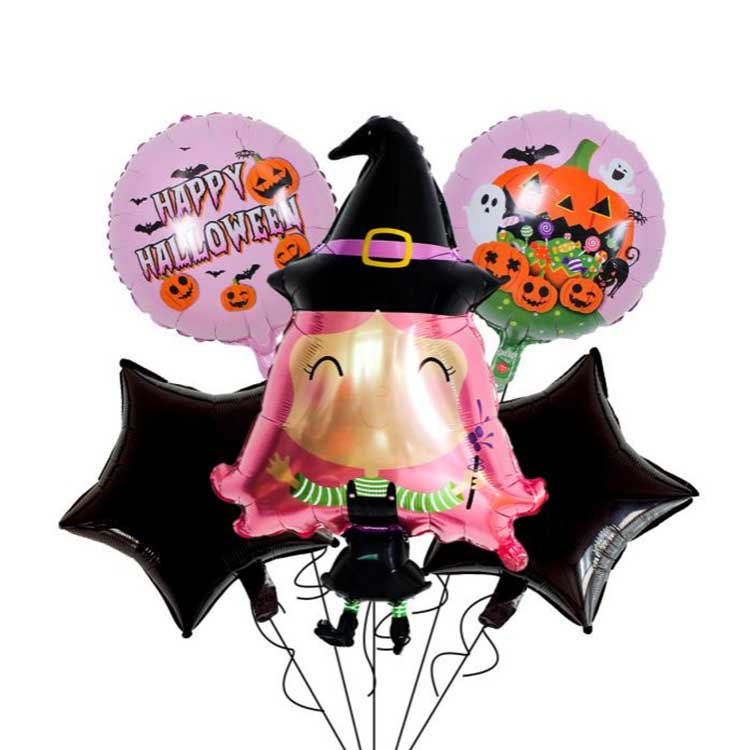 Ein fünfteiliges Halloween-Set ist ein Ballonset, das speziell für Halloween entwickelt wurde. Es besteht typischerweise aus Folienballons, Latexballons und anderem Zubehör. Es umfasst insgesamt fünf Ballontypen! Jedes Set enthält ein Muster oder eine Figur, die perfekt zum Halloween-Thema passt. Perfekt für Halloween-Dekorationen. Sie können die Ballons sogar mit Helium füllen, damit sie schweben! Das verstärkt die geheimnisvolle Atmosphäre von Halloween wirklich!