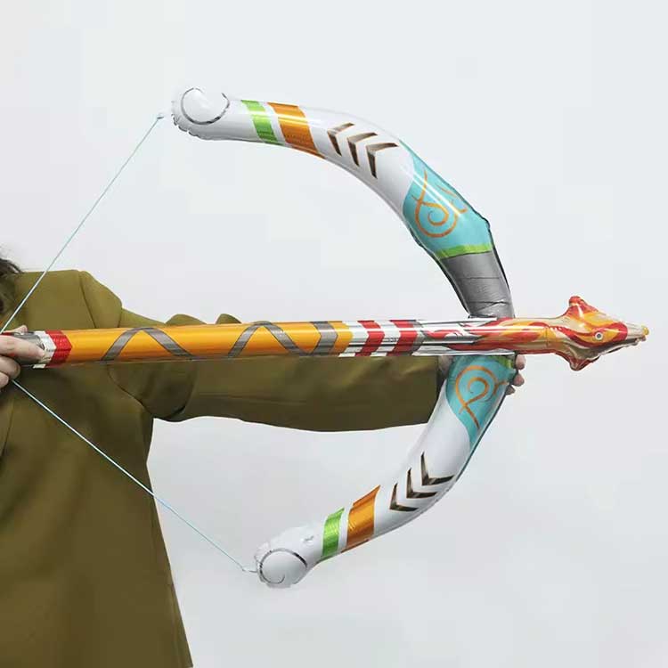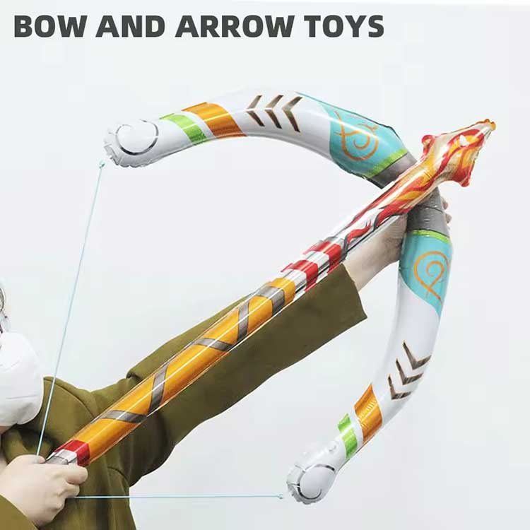 Aufblasen: Aufblasbares Pfeil- und Bogen-Spielzeugset, vollständig mit dem Mund oder einer kleinen Luftpumpe (normalerweise nicht im Lieferumfang enthalten).